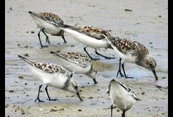 Otras especies se alimentan de distinta forma, por ejemplo el correlimos común es mucho más superficial a la hora de buscar presas, y el chorlitejo grande, que no tiene un pico tan afilado, primero sondea la zona con sus patas. Aquí los tenemos a vista de correlimos, a ras de suelo...