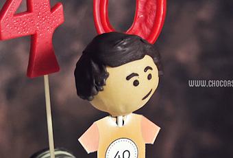 Una vez, de cháchara con los amigos, comentaba que no me gusta hacer años porque siento que me hago mayor. En un momento de inspiración / iluminación absoluta, un amigo me contestó: no es el día de tu cumpleaños lo que te hace mayor son los 365 días que hay entremedio. Aún estoy decidiendo si lo dijo para animarme o para hundirme en la miseria (jajaja). Sea como sea, hay cumpleaños especiales, de esos que se han de celebrar a lo grande. El 40 aniversario es una de esos aniversarios gordos. Por esos os quería enseñar la falsa tarta de cakepops con la que estuve entretenida el pasado sábado. 70 cakepops para celebrar un cambio de número y como colofón de la tarta un cakepop con la caricatura del cumpleañero.