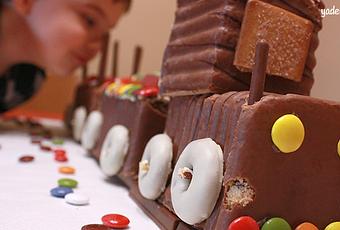 Nuestra tarta de tren es sencillísima, aunque al final el montaje lleva un poco más de tiempo que el que esperaba. El único misterio que tiene es el del ensamblaje de las piezas, porque absolutamente todo es comprado 😉 Los bizcochos que hacen de locomotora y vagones son tipo mármol y recubiertos de chocolate.