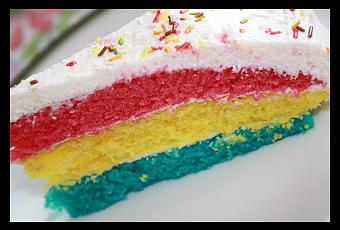 (Maria la había hecho de cinco plantas, pero reducí las cantidades un poco)para la masa;3 huevos150g azúcar120ml de zumo de naranja150ml de aceite de girasol225g harina1 sobre de levaduracolores comestiblespara la crema;200ml nata50g azúcar glass200g quark (queso fresco)fideos coloridos para decorarPrecalentamos el horno a 180°C. Ahora batimos los huevos y el azúcar hasta que esten espumosos y añadimos poco a poco el zumo de naranja y el aceite. Mezclamos la levadura con la harina y echamos todo a la masa. Ahora pesamos la masa que tenemos (yo tenía unos 800g de masa) y la dividimos (mentalmente) en tres partes para saber cuantos gramos de masa necesitamos para una planta.En mi caso, como tenía 800g de masa, necesitaba para cada planta 266g de masa. Ahora tengo un consejo; si empezais con los colores claritos y vais hacia los colores mas oscuros podeis usar el mismo recipiente para echar los colores comestibles, asi no teneis mucho que fregar al final. Siguiendo ese consejo empezamos con el color amarillo; quitamos 266g de la masa, le añadimos el color comestible y echamos la masa amarilla en un molde (de estos de que se quitan los laterales) cubierto con papel del horno. La primera planta la horneamos unos 12-15 minutos. Despues de sacar la primera planta, hacemos lo mismo con el color rojo y azul para luego tener las tres plantas de la tarta.Despues de dejar las plantas enfriar, hacemos la crema para juntarlas luego y "construir" nuestra tarta. Para la crema montamos la nata, añadimos el azúcar glass y el quark y ya esta lista. Ahora colocamos la primera planta en un plato, vertimos un poco de crema por encima y colocamos la segunda planta encima. Volvemos a vertir la crema y colocamos la última planta. Con el resto de crema pintamos toda la tarta por los lados y por arriba y luego decoramos con los fideos coloridos.Y ya esta! Como la veis? Mola no? :)
