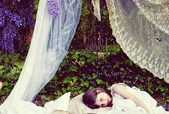 Este rincón de chicas con las gasas bordadas bajo las glicinias, que recuerdan a la época de nuestras abuelas, con esos grandes cojines