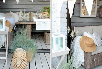 Os quiero mostrar una terraza de total actualidad combinando dos elementos en tendencia, el rattan y el color Blue green. Un porche diseñado para el conford y disfrutar del buen tiempo, con rincones diseñados para el relax, la lectura, el sol, el aperitivo......con una atmósfera natural, gracias al empleo de rattan, mimbre, paja, lino, algodón y plantas, que convive a la perfección con el color de moda en los países nórdico el Blue green.