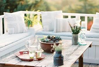 Con el calor que está haciendo en toda España, sólo puedo pensar en terrazas y en lugares donde relajarse al aire libre y refrescarse. Este es una maravilla no sólo por las vistas que tiene sino por la sencillez y con el gusto que está decorado. Pocos elementos pero todos muy acertados. De hecho, la rinconera es el asiento más cómodo para las terrazas porque aunque en un primer momento pueda parecer que roba mucho espacio es muy práctico al no tener que protegerlo cuando no se utilice. Este en concreto parece como realizado con palets, pintado en blancoy con una colchoneta hecha a medida y decorado con cojines en tonos claros con rayas y cuadros. La combinación con la mesa de centro de madera y la alfombra en tono tierra queda de maravilla. ¡Que paséis un buen miércoles! Imagen: Petit a Petit