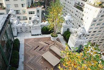 El reto de los diseñadores, fue crear un espacio agradable en medio del tráfico y el ruido de la gran ciudad. Lo más destacable es la perfecta conjunción de la madera con el granito, que circunda todo el perímetro de la terraza, y las impresionantes figuras que coronan la barandilla de la terraza, construida en ladrillo blanco.