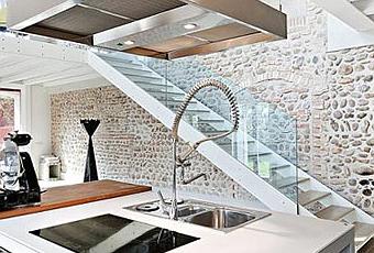 Una antigua villa italiana totalmente renovada de la que solo se conservan las paredes y los elementos arquitectónicos. Paredes de piedra y vigas de madera de estilo rústico conviven con muebles modernos, elementos metálicos y objetos de diseño, en perfecta armonía.