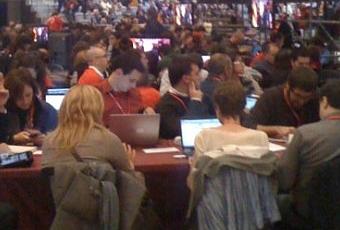 Por otro lado, ayer era importante. Los ciberactivistas del PSC que hemos trabajado deslocalizadamente, cada uno en su casa, por su cuenta con algunas líneas generales y una idea de que temas son importantes, con algunas herramientas que el partido iba sacando, pero basicamente con bastante actitud de guerrilla y autonomamente, nos podríamos ver, por primera vez en toda la campaña. Encontrarme con gente como Carme Sánchez, Joan Ramón, Bego Floria, Montse Capdevila, Jordi, Cristobal Avilés, Juan Antonio Corchado, Enrique Vanacloy o Cristian Alcázar que han estado al pié del cañón (y muchos otros, puede que ayer no los viera o que ahora no me acuerde), o el loco equipo de Barcelona del PSC como Pilar Bespín, César Millán, Lourdes Muñoz, Carles Maggi, Jose Manuel Sánchez, Enric Llorens, Bárbara Alonso o Amparo y saludar en el gallinero a Manuel Cáceres, tenía bastantes ganas de verles. Me siento muy orgulloso de tener como compañeros a unos miembros de la sectorial de ciberactivismo tan activos, autónomos y a los que no se necesita decir que tienen que hacer y los encuentras de forma espontánea en la red haciendo campaña, matizando, aportando.