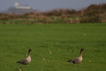 Pareja de ánsares piquicortos, con el faro de Tapia al fondoHacía varias semanas que una pareja de Ansares piquicortos (Anser brachyrhynchus) se dejaban ver por la rasa de Villadún y aunque se resistieron un poco, finalmente los conseguimos encontrar gracias a la ayuda de Gabriel, que los había localizado antes. Se encontraban pastando tranquilamente en el mismo sembrado de ballico donde se vieron las últimas veces.