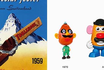 Por ejemplo tenemos las chocolatinas Toblerone que son de principios de 1908 y fueron de las primeras patentes en la industria alimentaria por su particular forma. Los primeros Mr Potatos tenían cuerpo y daban bastante miedito y fue el primer juguete anunciado por televisión.
