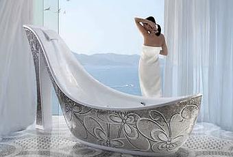 Estas originales bañeras las podemos encontrar con diversos diseños de flores, mariposas o curvas que hacen que sea una pieza muy sexy y femenina. De largo mide 270 cm y a la altura del tacón llega a alcanzar 165 cm. Están recubiertas de mosaico de vidrio.
