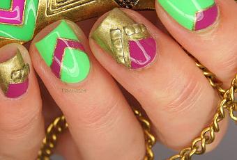 ¿Te acuerdas de mí? Soy Tamit24 de Fall in .. naiLove! Este post debería haber sido publicado hace una semana ... y vale, yo soy la principal razón de esta confusión, la culpa es mía. Pero finalmente estoy aquí, después de una semana de vacaciones, presentándote un diseño preparado para ti. Cuando vi este collar tuve dos pensamientos: "Debe ser el mío!" y "lo voy a utilizar como fuente de inspiración para el diseño nailart '. Los estilos azteca y étnico siempre me han tocado el corazón. Lo primero que hice fue preparar mis tachuelas. Repinté los cuadrados de plata con un esmalte oro para hacer que cuadraran los colores. Entonces empecé con mis uñas: tras una capa base apliqué dos capas de blanco para mis uñas de neón verde. Luego para evitar que se vieran los trazos del cepillo en las uñas de oro usé para aplicar el esmalte un pedazo de esponja. Entonces hice los triángulos de color púrpura con el método de la cinta que es uno de mis favoritos. Al final pinté a mano los detalles de oro y puse las tachuelas con una dotting tool. Para hacer que dure más tiempo en buen estado añadí un top coat brillante. Todos los esmaltes son de marcas que vienen directamente desde Polonia.