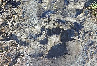 Con respecto a las huellas, en algunas obras se habla sobre la posibilidad de diferenciar huellas de perro de las de lobo, pero en realidad resulta muy difícil, por no decir imposible. El tamaño y la forma de las huellas dependen del animal que las haya dejado, pero la huella de un adulto tiene normalmente forma alargada, compacta y apiñada, de tamaño grande , unos 10 cm. Los mejores sustratos para detectarlas son el barro (para mí el mejor) y la nieve. Estas son varias fotos de huellas de lobo.