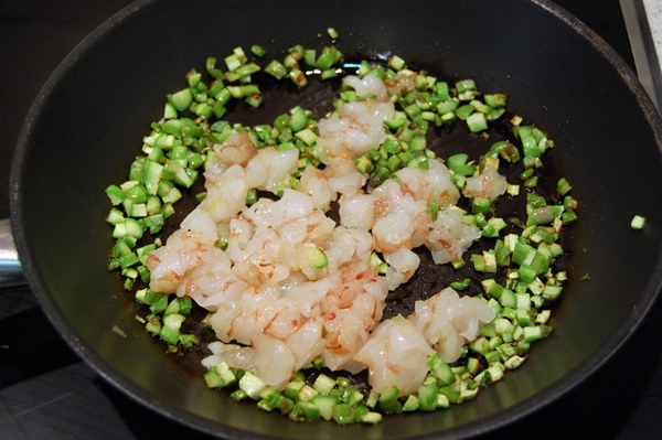 2.- Una vez pochados, agregamos las gambas picadas muy finas. Pochamos 1 minutos más.