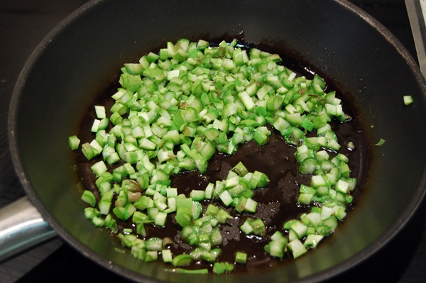 Elaboración 1.- Comenzamos picando muy finos los espárragos trigueros y los pochamos a fuego medio.