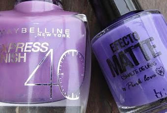 Vistos en sus respectivas botellitas parecian similares. Me compré el violeta (sin nombre ni número) Efecto Matte de Todo Moda y después llegó a mi vida el 210 Pastel Purple de Maybelline Express Finish (esos que se secan en 40 segundos).