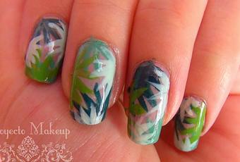 Adore!!!Tenia ganas de lago así, como los estampados que se vienen para esta temporada, de nuevo le estoy sacando el jugo a mis pincelitos divinos, siento que ahora puedo intentar de todo!Les cuento, de base hice una mezcla e un marrón de Pink Love y blanco de Colorama así me daba este nude, encima fui haciendo una especie de hojas usando todos los verdes que tengo, pero desde los mas oscuros hacia los mas claros y termine con mi top coat de siempre.
