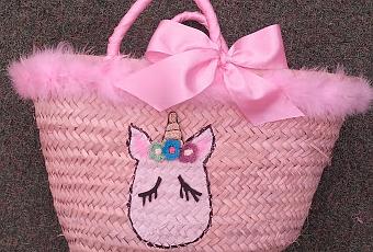 Pinté la cabecita del unicornio, le puse los ojitos y el cuerno con goma eva, unas flores de croché, asas forradas con lazo y un marabú rosa decorando y dándole el toque final a la cesta.