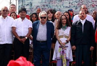 En Imagen: Los presidentes de Bolivia, Evo Morales; de Uruguay, José Mujica, y de Nicaragua, Daniel Ortega, junto al vicepresidente de Venezuela, Nicolás Maduro, durante los actos que marcan la continuidad del mandatario venezolano Hugo Chávez en el poder. fuente:la jornada en line, Xinhua