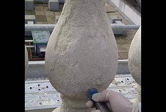 Eliminacion de capas de mortero a base de resinas, de mayor espesor, que no se ha eliminado con el decapante, especialmente en paños lisos donde se aplicó a llana, mediante abujardado mecánico de baja intensidad para no dañar el material pétreo de base. Se repasaran con gradina y cincel esquinas y puntos de dificel acceso.