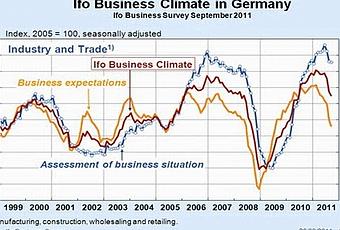 En las últimas semanas, ha habido signos inequívocos de que la crisis financiera de Europa se está transformando en una crisis económica de grueso calibre. El índice de confianza empresarial de Alemania (gráfica superior) cayó en septiembre por tercer mes consecutivo, dando cuenta que los riesgos a la baja van en aumento. El camino de la recesión se hace imparable y Jean-Claude Trichet, deberá revertir los errores cometidos en abril y julio, cuando subió las tasas de interés, repitiendo exactamente el mismo libreto del año 2008, cuando las elevó poco antes de la quiebra de Lehman. No es el único que se ha equivocado, en todo caso, en su lectura de la crisis.