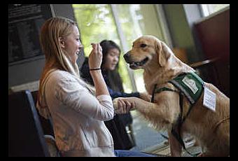 Melissa Bonnington, estudiante de derecho, juega con Hooch, un golden retriever, en la Universidad Emory en Atlanta. ATLANTA -- Al final del vestíbulo se ubica el mostrador de la recepción de la biblioteca de Derecho de la Universidad Emory. Y en una habitación que alberga textos legales antiguos, Stanley, el cachorro raza labrador, ladra sin cesar.Stanley gira por el suelo y muerde un juguete de plástico mientras los estudiantes de Derecho deambulan como zombis y ocasionalmente muestran una amplia sonrisa en sus cansados rostros al ver al cachorro. Terapia canina, justo a tiempo para la semana de exámenes de fin de curso.