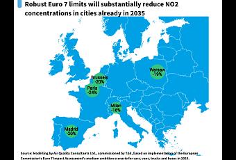 La investigación de Transport & Environment (T&E) realizada por Air Quality Consultants Ltd, destaca que un Euro 7 sólido reduciría la carga de las ciudades para abordar la contaminación del aire. Sin Euro 7, los puntos críticos de contaminación del aire con mayor tráfico en Bruselas, Madrid, París y Varsovia no cumplirán con el límite de contaminación del aire por NO 2 propuesto para la revisión de la Directiva de calidad del aire ambiente en 2035, a menos que se tomen otras medidas, como medidas más estrictas de baja y Se implementan zonas de cero emisiones.