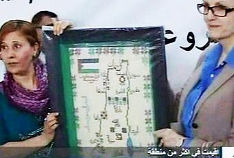 Ann Dismorr (derecha), la Directora de UNRWA en Líbano, posa con un mapa que borra el Estado de Israel y lo presenta como “Palestina”. (Fuente de la imagen: Televisión de la Autoridad Palestina a través de Palestinian Media Watch)