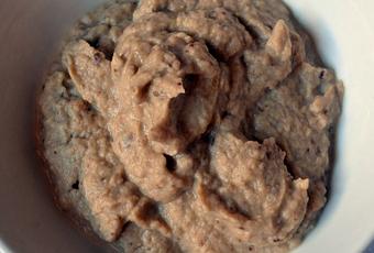 En un bol mezclamos la berenjena cocida, el zumo de medio limón y una cucharada de tahini o de semillas de sésamo tostadas. Lo trituramos con la ayuda de una batidora hasta que quede cremoso.