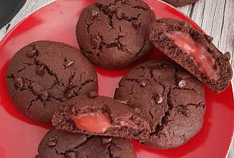 Para esta ocasión, quería inspirarme en una receta la conocida marca americana Chips Ahoy! ha creado para la última temporada. Las Upside-Down Cookies reflejan el portal de color oscuro con el rojo viscoso interior. En mi caso he horneado unas galletas de chocolate negro con relleno de puré de fresas que recuerdan a esa abertura hacia el otro mundo. La combinación es muy rica y crea un efecto sorpresa cuando vemos el rojo interior. ¡Pasamos a la receta!