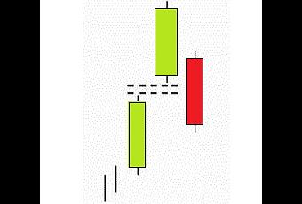La pauta se caracteriza por dos velas verdes y largas con un gap al alza entre ellos durante una tendencia alcista, el tercer día es una vela negra que cierra el gap a cierre de mercado, la vela roja se puede entender como toma de beneficios.