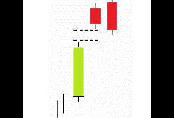 - El tercer día aparece una vela larga roja cuya apertura es superior a del segundo día y su cierre inferior envolviendo con su cuerpo la totalidad del primero y sin cerrar el gap.