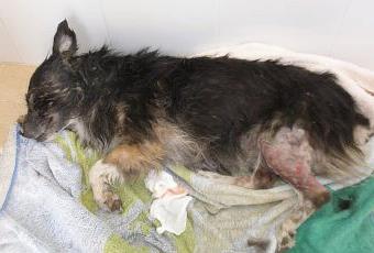 De su pata sale un hilo de sangre, la llevan corriendo al veterinario donde la sedan porque no deja que la toquen por el dolor. Su pata está inflamadísima, morada, con una infección tremenda y llena de agujeros, por lo que todo apunta a que está llena de perdigonazos, (ay esos casos del Sur...)