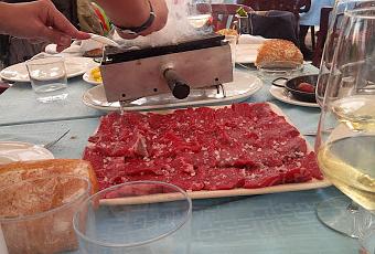- Chuletón de Carne roja para 3 (55,50€) un plato enorme del que comieron 4 adultos y lo sobró. Lo traen laminado, para comer a la piedra y la carne es de bastante calidad. Se puede pedir, por unos 40€ una ración para dos.