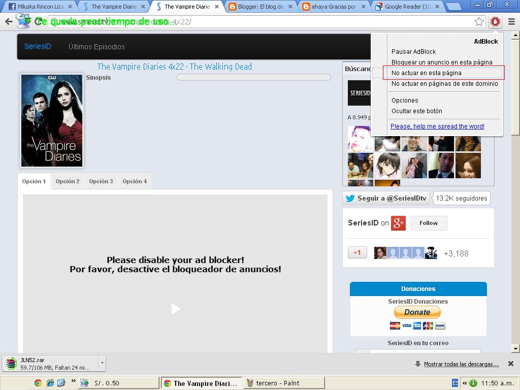 Nos sale un mensaje para desactivar el AdBlock para ver el vídeo para eso lo único que hacemos es ir al icono del a parte superior a la derecha de nuestro navegador y le decimos "No actuar en esta pagina".