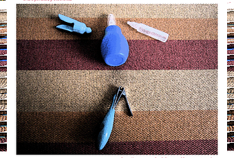 Con los moquis la cosa está complicada, lo lleva bastante peor en estos momentos.... primero suero fisiológico -frasquito situado en la zona superior dcha. de la foto- con aplicador -tubito de goma azul situado en la zona superior izda. de la foto- para ablandar e incluso diluir y posteriormente, siempre que eso no funcione, aspirador nasal -situado en la foto entre el aplicador y el suero fisiológico- ... lleva mal ambas cosas.. y de momento no he hallado otro modo de hacerlo.. Como único truco, hacerlo lo más rápido posible para que la nena no se ponga muy nerviosa y nos lo ponga difícil....