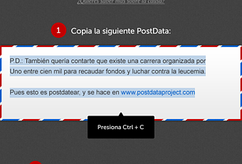 Como parte fundamental cabe destacar la sencillez con la que el usuario puede realizar su ‘postdata’, entrando en la web de Postdata Project* www.postdataproject.com y siguiendo unos sencillos pasos, el usuario tendrá la posibilidad de ceder un pequeño especio para la solidaridad.