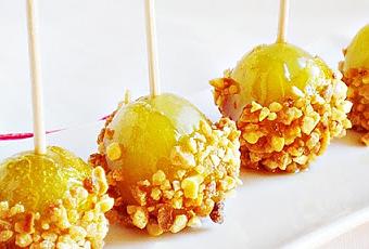 Bañar las uvas en ese caramelo y a continuación sumergirlas en la almendra, solo una parte, para que la almendra se peque. Colocar encima de papel de hornera hasta que se sequen. Servir.