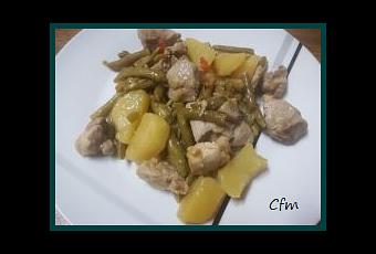 -Judías verdes redondas limpias-Patatas peladas, limpias y troceadas-Estofado de cerdo limpio y troceado-Sal-Pimienta negra-Ajo picado -Jengibre-Aceite de oliva-Cebolla en juliana-Pimiento amarillo en juliana-Tomate troceado en gajos finos-Vinagre blanco-Salsa de soja-Salsa de ostra-Caldo de pollo (RECETA)