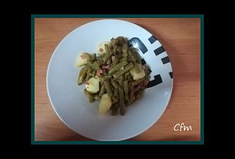 -1 kg de vainas-1 patata grande-250 gr de tacos de jamón serrano-1 diente de ajo-1 cebolla-Pimentón dulce al gusto-Aceite de oliva