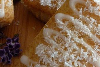 3 huevos L, 270 gr de harina, 30 gr de coco seco rallado, 150 gr de azúcar, 150 ml de aceite de millo o vegetal, una pizca de sal, esencia de coco, 150 ml de leche y 16 gr de levadura en polvo.Glasa: 3-4 cucharadas de azúcar glas, unas gotas de agua y esencia de coco.Coco seco rallado.PREPARACIÓN