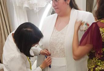 La primera prueba reúne a parte del equipo del atelier y a la novia, momento en el que se colocan los primeros ajustes, se marcan los retoques necesarios y se deciden los detalles y adornos. Posteriormente, el vestido se ajusta y se vuelve a probar, incorporando todas las correcciones hasta lograr un resultado perfecto.