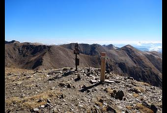 Giramos a la izquierda y continuamos por la cresta hasta la cima del Pic d'Eina (2.794 m). Desde el Pic d'Eina se puede acceder fácilmente hasta el Pic de Noufonts (2.864 m). Para ello, bajamos por la cresta siguiendo rastros de camino que no presenta la más mínima dificultad. El Pic de Noufonts es una gran explanada coronada con una cruz de hierro. Esta zona plana es testimonio geológico de que nos encontramos en punto muy viejo que ha padecido una fuerte erosión.
