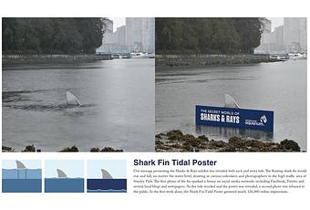 El Acuario de Vancouver (Canadá) ha ideado una valla publictaria exterior de lo más original, que usa el nivel del agua para desvelar el mensaje. Cuando la marea está alta, tan solo se puede ver la parte superior de la valla publicitaria que se asemeja a la aleta de un tiburón. Cuando desciende el nivel del agua, ya se puede apreciar el mensaje publicitario del acuario, que nos invita a visitar a los tiburones y rayas que hay en sus instalaciones. Esta valla publicitaria acuática ha tenido una gran repercusión en las redes sociales.