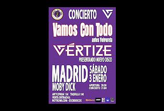Vamos con todo (antes Volvoreta) estarán en el escenario de Moby Dick Club presentando sus mejores canciones en esta sala, una banda de rock que están al laza y quieren presentarnos sus mejores canciones. Por su parte Vértize harán lo propio presentando sus nuevos temas en este inicio de año, la formación tiene mucho que ofrecer y mostrare en directo.