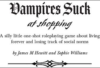 Vampires Suck At Shopping es un divertido y pequeño juego de rol, creado por Needy Cat Games (James M Hewitt & Sophie Williams), con reglas sencillas y narrativas para partidas de unas 2 o 3 horas de duración. En este juego, los jugadores asumen los roles de vampiros inmortales y todopoderosos que están haciendo todo lo posible para completar una tarea sorprendentemente mundana, en un mundo que dejó de tener sentido para ellos hace uno o dos siglos. Por ejemplo, ir a un centro comercial a comprar ropa o tener que hacer frente a una tubería que gotea en su morada y está inundando el sótano.