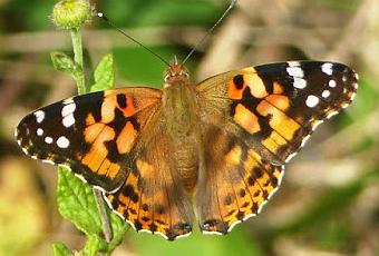 En julio se aprecia un claro descenso en los registros de cardera, que es la consecuencia de que los ejemplares que han llegado van muriendo, y aún no emergen los de la nueva generación, descendiente de los anteriores. Los primeros ejemplares nuevos no los registré hasta pasada la primera semana de agosto, por lo que es posible que su desarrollo se alargue entre 6 y 8 semanas. Son mariposas que destacan inmediatamente por sus tonos frescos y sus colores vivos, como ésta de la zona de Moniello.
