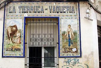 En la calle Monte Igueldo, 103, se conserva el precioso mural de azulejos de lo que en su día fué una vaquería. El nombre de «La Tierruca» nos sugiere que sus propietarios pudieron ser de Cantabria, donde se usa la entrañable terminación en «uca». El mural es obra de Enrique Guijo, uno de los mejores ceramistas del primer tercio del siglo XX, cuyos dibujos rezumaban encanto. Guijo tenía su taller en la calle Mayor, 80. En el panel contiguo vemos el original sistema, con forma de mesa, que servía para transportar las lecheras. Eran los tiempos en que el lechero llevaba la leche a domicilio cada amanecer. Las vaquerías solían tener vacas propias en el interior de los locales y la leche se ordeñaba a la vista del público. En 1965 la ley prohibió los establos urbanos por considerarlos poco higiénicos. Seguramente se ganó en higiene, pero, al decir de los más viejos del lugar, la leche ya no ha vuelto a tener el sabor de antes.