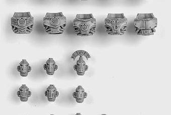 El otro set,con el mismo precio(24 libras esterlinas,33 euros aproximadamente) y mismo numero y disposición de componentes es el Mk IV Invictarii,una variante especial a modo de galardón para los veteranos victoriosos y que es la base del modelo actual que usan,al menos el yelmo,la Guardia de Honor del Señor del Capítulo.Su primera aparición es en unos bocetos de John Blanche bajo el epígrafe "Varangii Guard",una especie de versión de la "Guardia Varega" pero en de los Ultramarines que eran la supuesta guardia pretoriana de Guilliman.Pero no se sabe mucho mas de ellos y de boceto no han pasado.La parte frontal del yelmo,eso si,se ha usado para otras ilustraciones(No tanto como la anterior,eso si) y como base de algunas figuras y componentes,como estos.Como en el caso anterior,lo mas distintivo es el yelmo,que aquí es con cimeramientras que en las ilustraciones es mas tipo "pickelhaube" o sin nada .En las,ilustraciones,pocas,parece que usaban una variante de la Mk VII,pero esta no se por que me pega mas con la Mk IV.