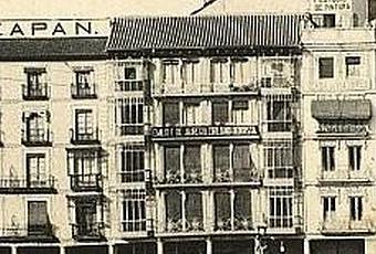 Una postal de Purger&Comuestra el aspecto de esta manzana hacia 1900 con una desornamentada fachada, levemente cóncava, con varios anuncios, como el de la Relojería regentada por el «antiguo oficial de Álvarez», un organillero y algunas mujeres acudiendo con cántaros a la fuente instalada en 1866.
