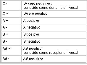 - Sangre del grupo O: carece de aglutinógenos en la superficie de sus eritrocitos. En el plasma contiene dos tipos de aglutininas, las anti A y las anti B, o sea contra ambos tipos de aglutinógenos.Respecto a la determinación, filial, de los grupos sanguíneos (independientemente de su Factor Rh positivo o negativo) el cuadro es el siguiente: