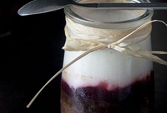 Para la capa de cerezas 250 g de cerezas sin hueso (si no es temporada de cerezas puedes usar otra fruta como melocotón...) 100 g de azúcar (puedes usar también una cucharada y media de sirope de ágave) un poco de zumo de limón (como medio limón más o menos) 2 g de agar agar